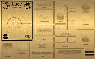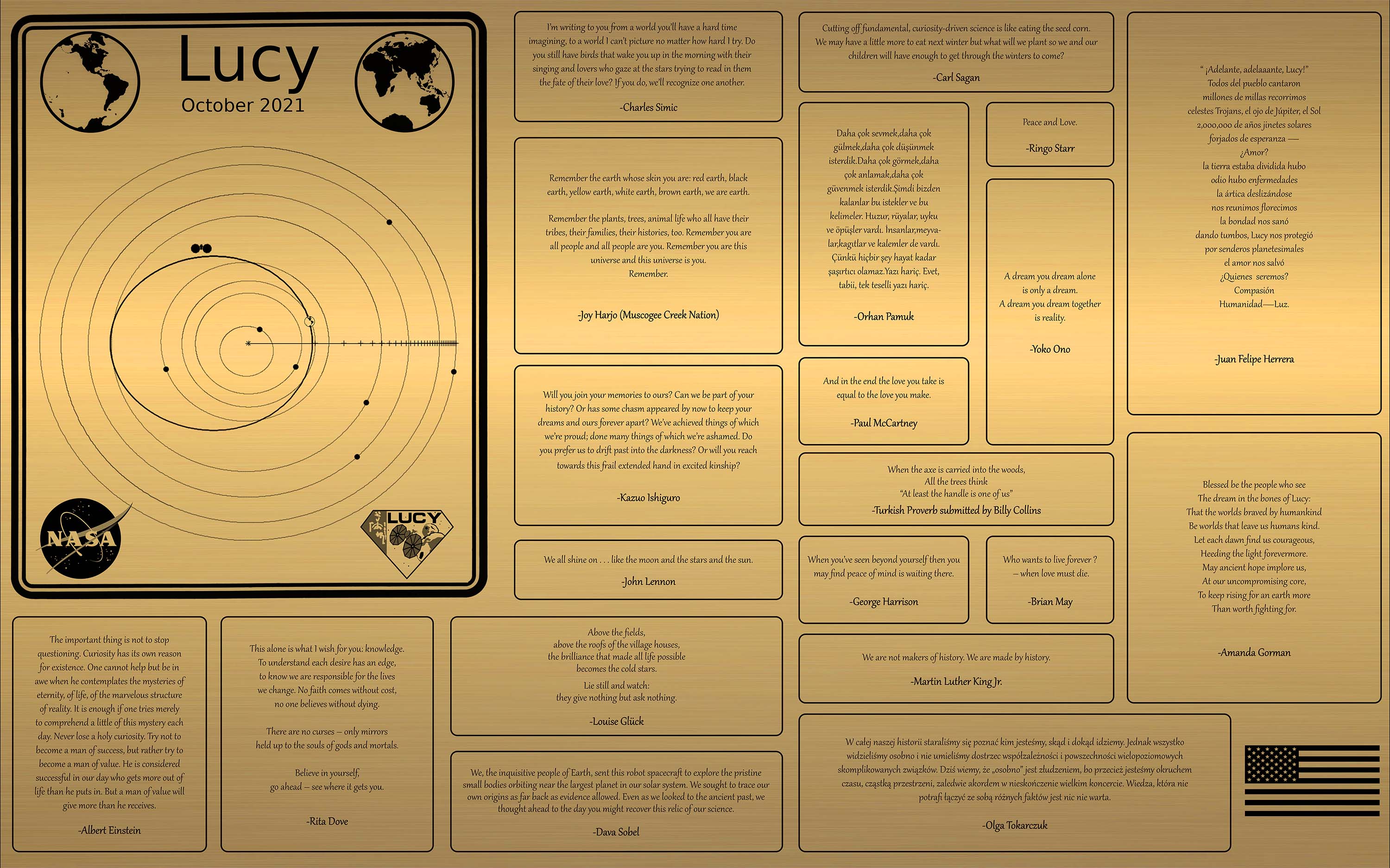 Además, siguiendo la tradición de incluir mensajes para la posteridad en las naves Pioneer 10 y 11 (placas) y Voyager 1 y 2 (discos de oro), la nave espacial Lucy llevará una placa similar. Sin embargo, debido a que esta sonda no tiene previsto abandonar nuestro sistema solar, la placa de Lucy es una cápsula del tiempo con mensajes para nuestros descendientes. La placa contiene mensajes de personajes relevantes de la sociedad de esta época (a lgunos premios Nobel de Literatura, los poetas laureados de los Estados Unidos y otras figuras). También incluye una representación del sistema solar el día del lanzamiento anticipado de Lucy el 16 de octubre de 2021 y la trayectoria original de la nave viajando entre los enjambres de Troya y la órbita de la Tierra.
