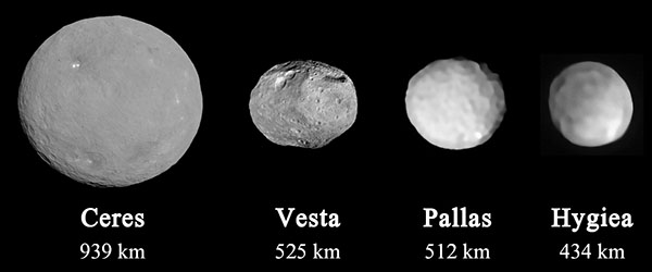 (4) Vesta: con un diámetro de 575 km, tiene un tamaño parejo a Palas pero con más masa que este (tiene el 9% de la masa total del cinturón de esteroides). Su nombre se debe a la diosa virgen del hogar de la mitología romana. El hallazgo se produjo el 29 de marzo de 1807 desde Bremen por Olbers. Fue el cuarto cuerpo descubierto en el cinturón principal de asteroides, tras Ceres, Juno y Palas.