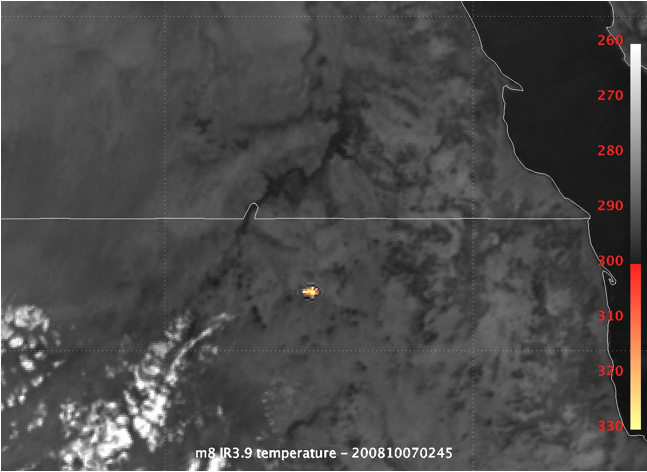La bola de fuego se observó visualmente, en el infrarrojo y por infrasonidos de muy baja frecuencia. Como se puede apreciar en la imagen adjunta, fue captada por el satélite Meteosat 8, apreciándose una mancha (fue visible en longitudes de onda desde el visible hasta el infrarrojo). La fecha y la posición estimadas en las imágenes del Meteosat 8 son imprecisas, pero coinciden aproximadamente con la estimación de la órbita del JPL. La línea blanca del medio de la imagen marca la frontera (con variaciones) entre Egipto (al norte) y Sudán (al sur). La escala de la derecha indica la intensidad de la imagen.