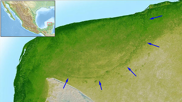Sin duda, el más famoso asteroide por el riesgo que acabó materializándose en un impacto colosal sobre la península de Yucatán (México) fue el asteroide de Chicxulub. En la ilustración adjunta se muestra una imagen en relieve sombreado de la esquina noroeste de la península de Yucatán (México), generada a partir de datos de la Shuttle Radar Topography Mission (SRTM). Es una fotografía mejorada por computadora, con una topografía muy exagerada para resaltar la depresión semicircular, la línea de arco verde más oscura en la esquina superior izquierda de la península. Esta línea semicircular es una indicación sutil, pero inconfundible, del cráter de impacto de Chicxulub; es el borde o límite exterior del cráter enterrado y tiene solo entre 3 y 5 metros de profundidad y unos 5 km de anchura (se ha marcado con flechas para facilitar su localización).