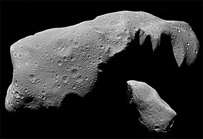 Ida (arriba) y Gaspra (abajo) a escala fotografiadas por la sonda Galileo el 28/8/1993 (a 3.000-3.800 km) y 29/10/1991 (a 5.300 km), respectivamente (NASA / JPL / USGS). Ampliar.