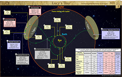 Trayectoria de Lucy tomada del artículo «Lucy: Surveying the Diversity of the Trojan Asteroids: The Fossils of Planet Formation» (Bibcode:2017LPI....48.2025L; Lunar and Planetary Science Conference). Ampliar.