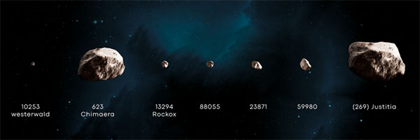 - (269) Justicia: el asteroide del cinturón principal Justicia (Justitia en inglés) fue descubierto el 21 de septiembre de 1887 por el astrónomo austriaco J. Palisa desde el observatorio de Viena (Austria). Su nombre es el de la diosa romana de la justicia (Iustitia en latín). Tiene un tamaño respetable, con un diámetro de 50,73 km, y se encuentra en el cinturón de asteroides, a una distancia de la Tierra de 5.000 millones de kilómetros. Este asteroide de color rojizo (por la acumulación de tolinas en su superficie) es, en principio, el último y principal onjetivo de la misión MBR Explorer. Los Emiratos Árabes Unidos pretenden con su nave espacial lograr una inserción orbital en octubre de 2034 y confían en lograr el histórico objetivo de posar sobre su superficie un módulo de aterrizaje, hecho que se producirá, según el actual cronograma, en mayo de 2035.