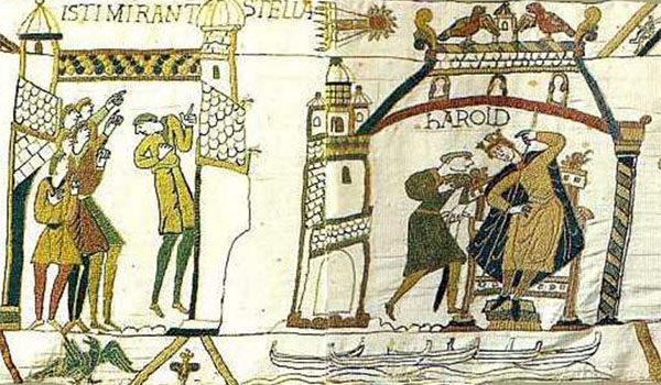 Una de las primeras impresiones de un cometa fue la que aparece en el Tapiz de Bayeux de finales del siglo XI. Este tapiz excepcional, de 70 metros de largo y tan solo 0,5 m de ancho, que representa la conquista normanda de Inglaterra a los sajones en setenta y tres escenas. Era el cometa Halley, y su aparición, entre el 24 y el 30 de abril de 1066, debió resultar significativa en la contienda, ya que los sajones interpretaron al cometa como una señal de mal agüero en la coronación del rey Haroldo II de Inglaterra, mientras que los normandos lo interpretaron como una señal divina de victoria.