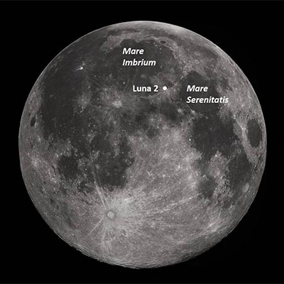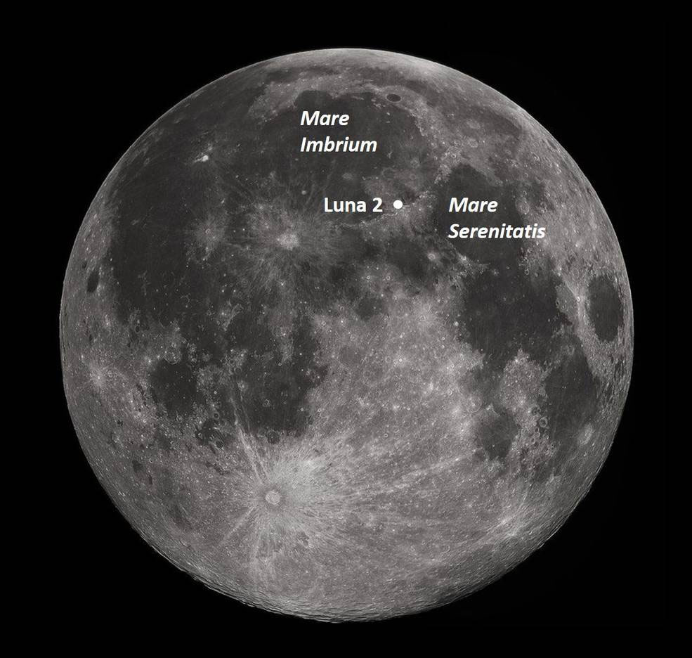 Tras otro lanzamiento fallido en junio de 1959, los soviéticos lanzaron el 12 de septiembre su segundo cohete cósmico, que se nombraría posteriormente Luna 2.Con él lograron un tremendo hito: fue la primera nave espacial que alcanzó otro cuerpo celeste, la luna, contra la que chocó deliberadamente el 13 de septiembre de 1959 a las 22:02:24 (hora peninsular española), entre Mare Imbrium («mar de la lluvia») y Mare Serenitatis («mar de la serenidad»).