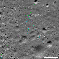 En la fotografía del margen izquierdo (ampliar), publicada por la NASA el 2 de diciembre de 2019 (a partir de otras anteriores tomadas por la Lunar Reconnaissance Orbiter, LRO) se muestra el punto de impacto de Vikram Lander y el campo de escombros asociado. En ella, los puntos verdes indican restos de naves y los azules ubican el suelo alterado; la «S» indica escombros identificados por S. Subramanian