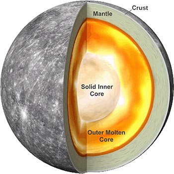Mercurio no tiene, como nosotros, un satélite que genere fuerzas de marea ni tiene nuestra rápida rotación, sin embargo su órbita excéntrica alrededor del Sol (la más excéntrica de los planetas del sistema solar, con un eje menor de 46.000 km y un eje mayor de 70.000, hace que la fuerza gravitaciónal que ejerce el Sol sobre él aumente y disminuya periódicamente, y esto hace que se comprima y dilate por las fuerzas de marea, consiguiendo así mantener el núcleo fundido, lo que hace efecto de dinamo.