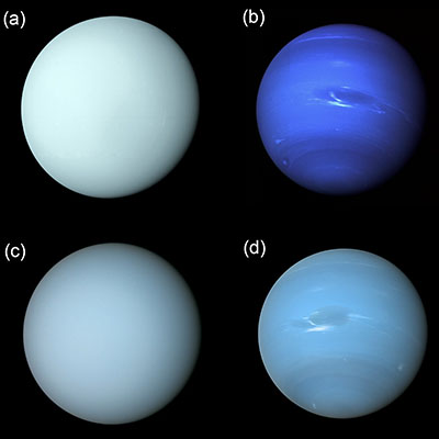 En la imagen adjunta los paneles a y b muestran imágenes antiguas de la apariencia visible de Urano y Neptuno reconstruidas a partir de imágenes de la ISS de la Voyager 2 en 1986 y 1989, respectivamente, que muestran a Urano de un azul verdoso pálido y a Neptuno de un azul oscuro. Estas primeras imágenes de Urano se acercaban al color real, pero las imágenes de Neptuno fueron procesadas para obtener un color mejorado. Los paneles c y d muestran reconstrucciones más recientes de los colores reales de estos planetas, que demuestran que tienen colores más similares.