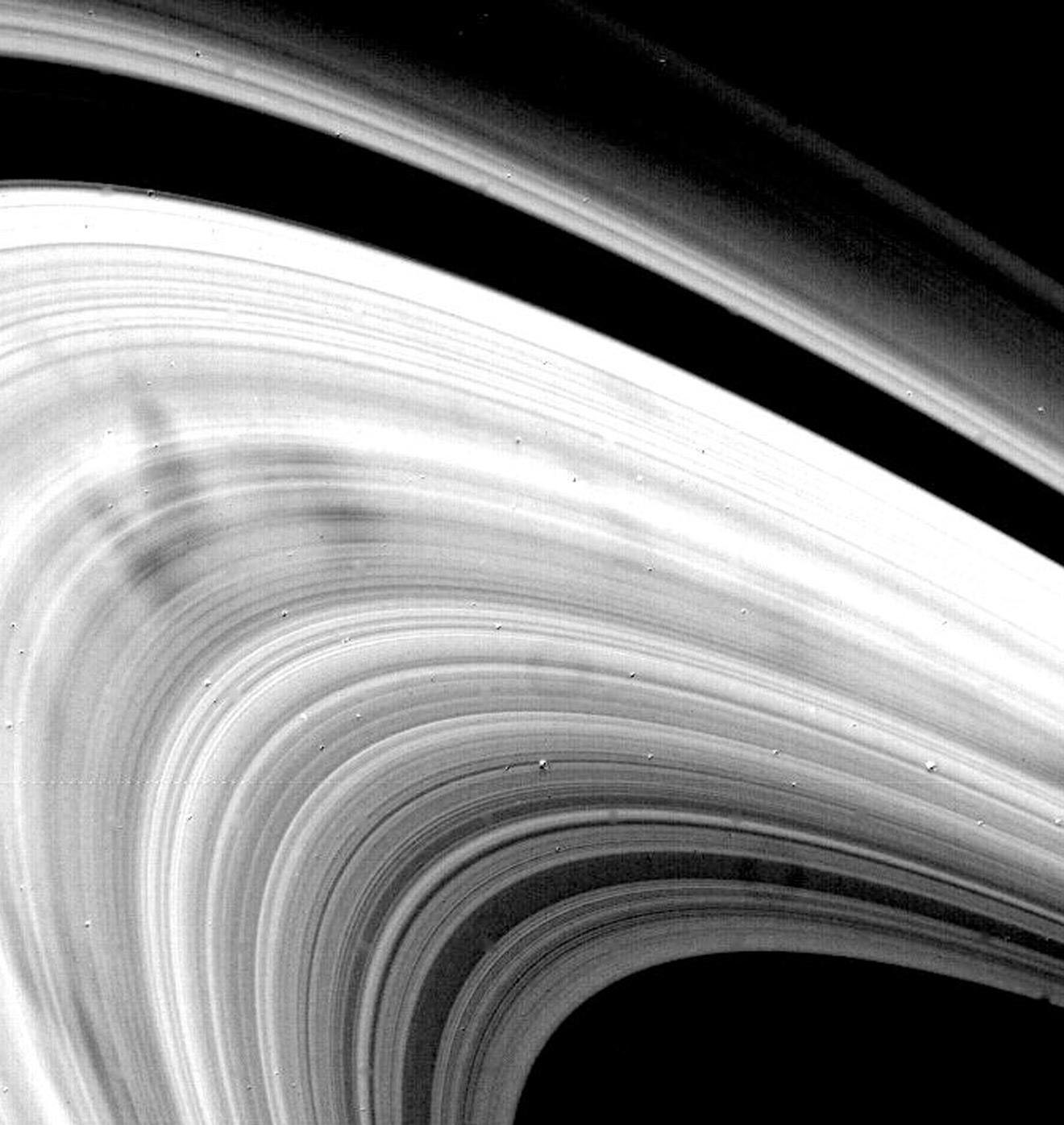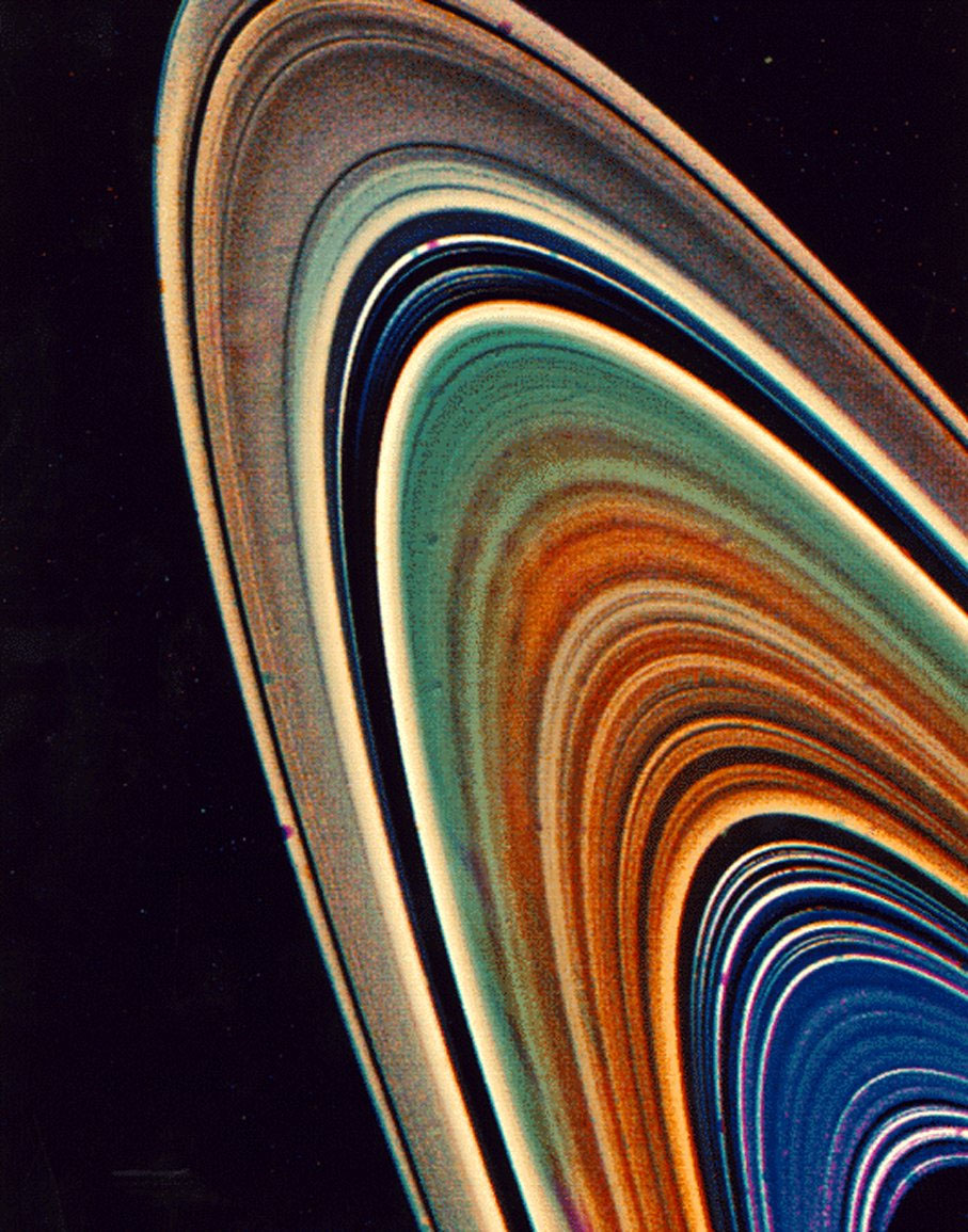 Entre las fotos de alta precisión tomadas por la sonda, destacan las dos recogidas en los márgenees de este texto. En la fotografía de la izquierda, tomada a 4 millones de kilómetros, se aprecian de forma clara las numerosas características llamadas «radios» en el anillo B; su apariencia muy afilada y estrecha sugiere tiempos de formación cortos. En la ilustración de la derecha se destacan, con el falso color, las variaciones de color debidas a las diferencias en la composición de las partículas que forman los anillos, realzadas al combinar marcos ultraviloetas, transparente y naranja. Se tomó desde 8,9 millones de km, 9 días antes de la máxima aproximación, y abarca unos 68.000 km de arriba a abajo.