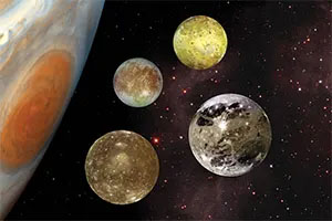- Lunas de Júpiter: composición del sistema joviano que incluye el borde de Júpiter con su Gran Mancha Roja y los cuatro satélites galileanos —de arriba a abajo: Ío, Europa, Ganímedes y Calisto— (NASA/JPL/DLR). Enlace a la imagen.