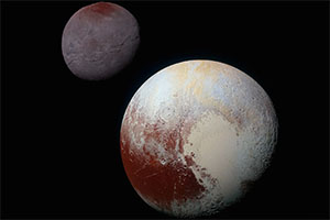 - Lunas de Plutón: composición de imágenes en color mejoradas de Plutón (abajo a la derecha) y Caronte (arriba a la izquierda) tomada por New Horizons el 14 de julio de 2015 (NASA/JHUAPL/SwRI). Enlace a la imagen.