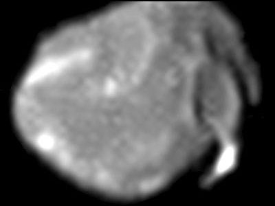 Amaltea fotografiada, en una de las mejores resoluciones de la luna, por la sonda Galileo de la NASA el 26 de noviembre de 1999 a 374,000 km. Se diferencian en el borde derecho un gran cráter de impacto con dos crestas, en su zona superior, en «V». A la izquierda de estas, en la parte superior central de la imagen se evidencia el cráter Gea con la banda brillante «Ida» (NASA / JPL / Universidad de Cornell).