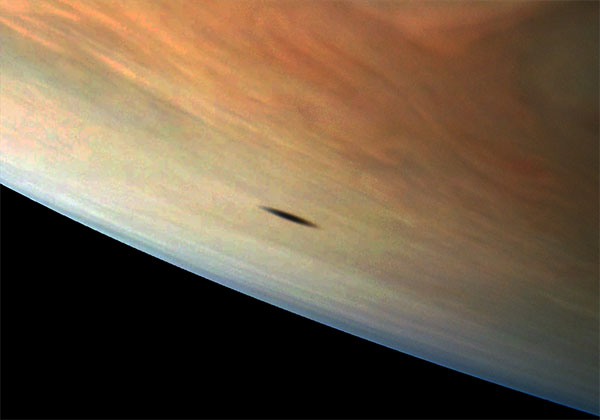 Imagen de la sombra de Amaltea sobre la superficie de Júpiter tomada por la nave Juno el 1 de septiembre de 2017. En el momento de la foto, la nave se encontraba a 3.858 km de la parte superior de las nubes del planeta. La forma alargada de la sombra no solo es consecuencia de la ubicación de la luna en relación con Júpiter sino también de la forma irregular de la propia luna (imagen mejorada de Gerald Eichstädt y Sean Doran basada en imágenes proporcionadas por NASA / JPL-Caltech / SwRI / MSSS).