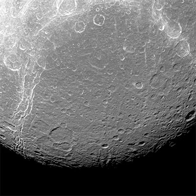 Aproximación, el 11 de octubre de 2005, de la nave Cassini a Dione con Saturno y sus anillos de fondo. Va desde 107.000 km a 4.000 km (escala: 234 m/píxel) de distancia a la superficie lunar. La duración real de la secuencia es de 3,5 horas (NASA / JPL / Instituto de Ciencias Espaciales).