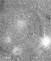 En su superfice aparecen regiones grandes y brillantes de crestas y surcos que atraviesan terrenos más antiguos y oscuros. Estas regiones ranuradas son una pista de que la luna sufrió trastornos dramáticos en el pasado lejano. Los científicos también han encontrado una fuerte evidencia de un océano subterráneo en Ganimedes.