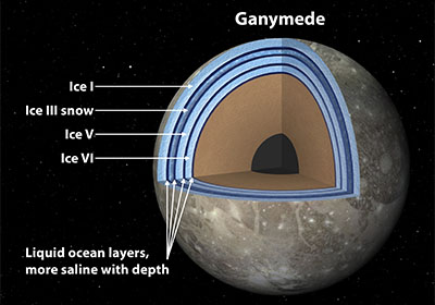 Así el hielo se encontraría en varias formas según las presiones. Ice I («Hielo I») es la forma menos densa de hielo, la que flotaría. A medida que aumentan las presiones, las moléculas de hielo se compactan y, por tanto, se hace más densas (como los océanos de Ganimedes tienen hasta 800 kilómetros de profundidad, experimentarían más presión que los océanos de la Tierra). La forma más profunda y densa de hielo que se cree que existe en Ganimedes se llama Ice VI («Hielo VI»).