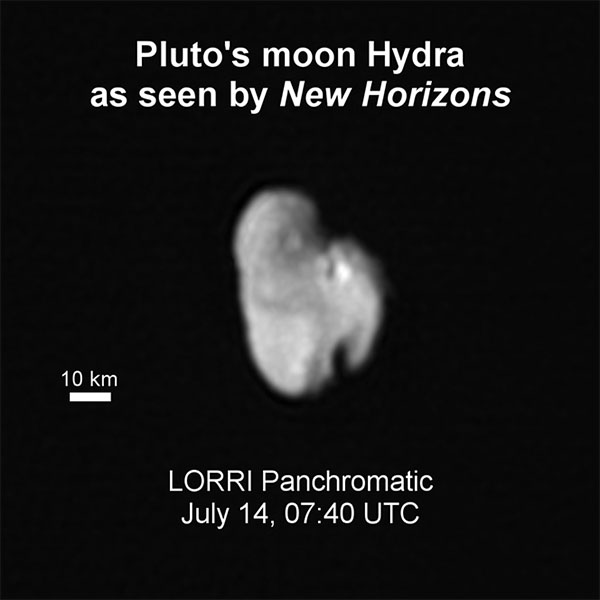 Hidra, al igual que Nix, es aproximadamente 5.000 veces más débil que Plutón y está entre dos y tres veces más lejos de Plutón que su luna más grande, Caronte. Ambas lunas son tan pequeñas y tan débiles que los científicos combinaron una exposición corta de Plutón y Caronte y una exposición prolongada de Nix e Hydra para crear imágenes de todos ellos juntos.