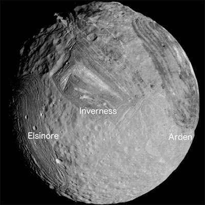 Miranda, el más interno y más pequeño de los cinco satélites principales. Esta luna cuasiesférica tiene unos 500 km de diámetro, lo cual es solo una séptima parte del tamaño de la luna de la Tierra, un tamaño que parece poco probable que soporte mucha actividad tectónica Sin embargo, geológicamente, Miranda ha sido el cuerpo más activo del sistema solar.