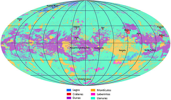 Primer mapa geológico global de Titán, basado en imágenes de radar e imágenes de luz visible de la misión Cassini de la NASA, que orbitó Saturno de 2004 a 2017, e imágenes del Subsistema de Ciencia de Imágenes (ISS). Las etiquetas apuntan a varias de las características de la superficie nombradas (NASA / JPL-Caltech / ASU; traducción: Albysol).