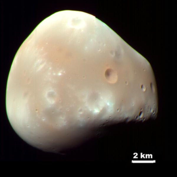 Deimos es un objeto pequeño y abultado, lleno de cráteres, pero estos tienen generalmente menos de 2,5 kilómetros de diámetro y carecen de los surcos y crestas que se ven en Fobos.