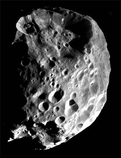 Mosaico de dos imágenes de Febe tomadas durante el sobrevuelo de la Cassini el 11 de junio de 2004 (NASA / JPL).