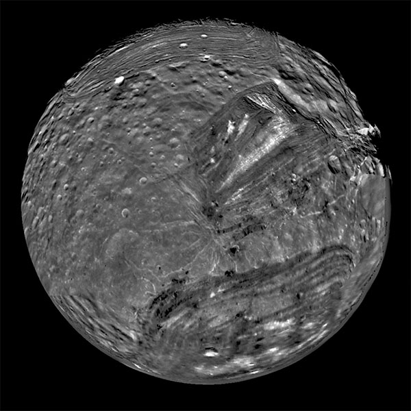 Miranda, el más interno y más pequeño de los cinco satélites principales. Esta luna cuasiesférica tiene unos 500 km de diámetro, lo cual es solo una séptima parte del tamaño de la luna de la Tierra, un tamaño que parece poco probable que soporte mucha actividad tectónica Sin embargo, geológicamente, Miranda ha sido el cuerpo más activo del sistema solar.