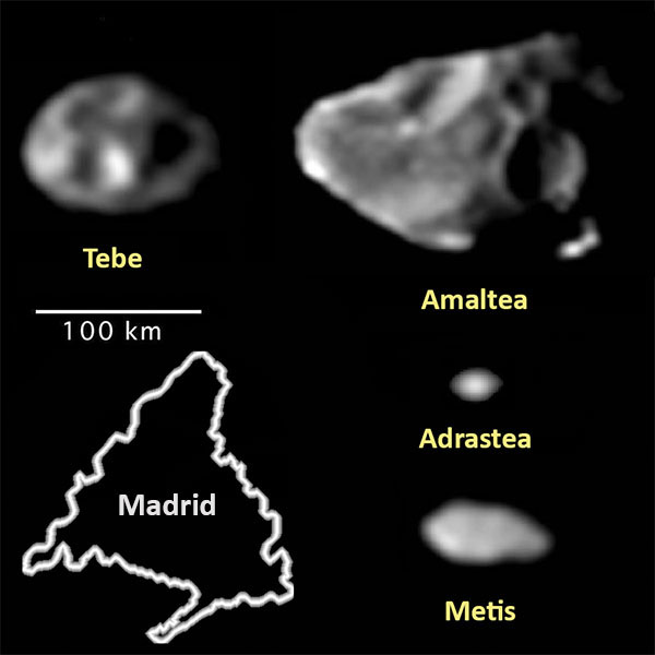 Comparativa de Tebe con los otros tres pequeños satélites interiores de Júpiter tomados a la misma escala que la provincia de Madrid. Las fotografías fueron tomadas por el sistema de imágenes de estado sólido (SSI) en la nave espacial Galileo de la NASA (NASA / JPL / Universidad de Cornell / Montaje, rótulos y comparativa con Madrid: Albysol).