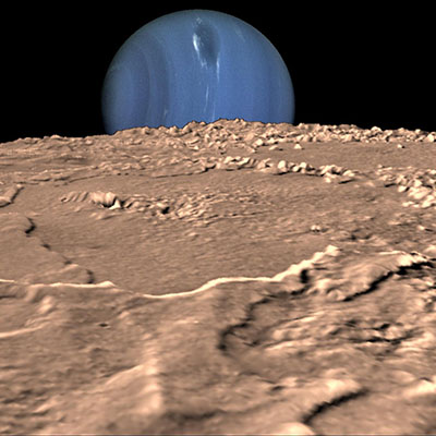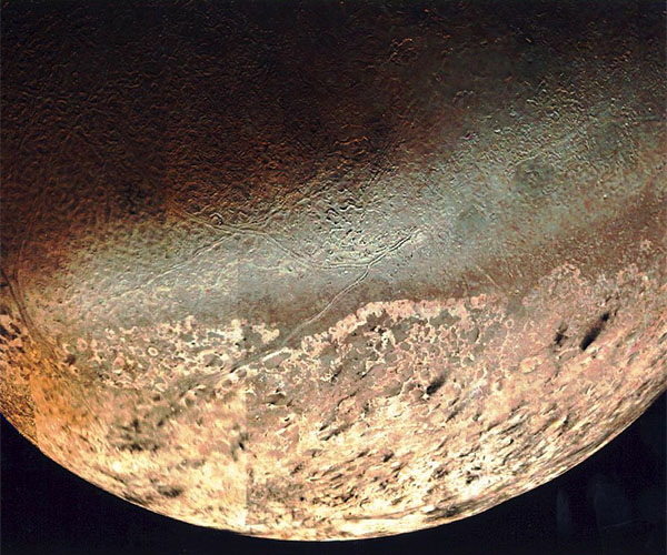 La nave espacial Voyager 2 de la NASA tomó unas históricas imágenes de Tritón en su aproximación en agosto de 1989 (con resolucines de 600 m/píxel). El encuentro con la luna, en esta secuencia, comienza aproximadamente a 3 días fuera de Triton, extendiéndose una semana en la trayectoria de salida, y a una velocidad de 25 km/s. Estas imágenes han sido mejoradas y usadas para construir el mejor mapa de colores global de esta extraña luna, aunque son una aproximación de los reales (NASA / JPL-Caltech / Instituto Lunar y Planetario en Houston —EE. UU.—/ Dr. Paul Schenk —del citado Instituto—, partícipe con su mapa de Tritón).