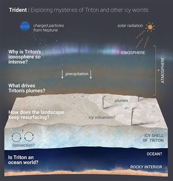 A pesar de su extrema frialdad supericial, los volcanes de hielo arrojan lo que probablemente sea una mezcla de nitrógeno líquido, metano y polvo, que se congela instantáneamente y luego vuelve a caer a la superficie. Una imagen de la Voyager 2 muestra una fumarola helada que se dispara a 8 kilómetros hacia el cielo y se desplaza 140 kilómetros a favor del viento.